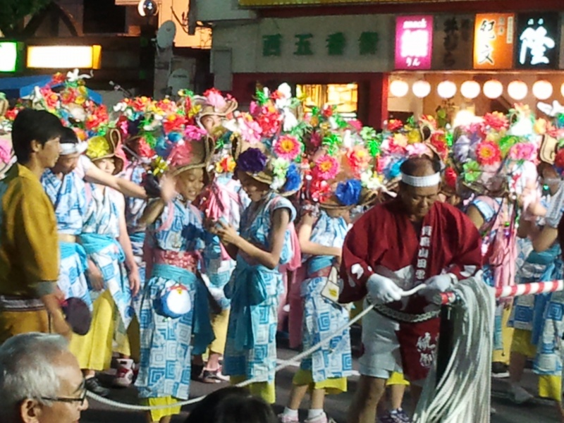 さて、7:10になると花火を合図に、佞武多(ねぶた)&お囃子&跳人の行進です。