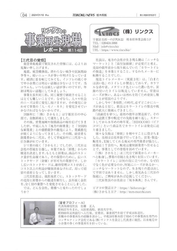 リンクスの事業再生現場レポート 第114回 2024年01月18日 帝国データバンクニュース PDFで見る リンクスの事業再生現場レポート 第115回 >> << 不審メールに関するお詫びとお知らせ お問い合わせはお気軽にどうぞ! live_helpお問い合わせ ご相談は無料です。 スタッフブログ 事業再生の現場から迷わず行けよ 行けばわかるさ!徒然~書士日記~ 事業再生本のご紹介 社長!御社は銀行からまだまだおカネを借りられますよ!村上 浩 この本を読めば、「債務超過」だろうと「破たん懸念先」だろうと融資を受けられます! chevron_right詳しく見る