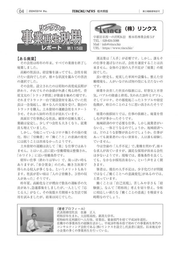 リンクスの事業再生現場レポート 第115回 2024年03月14日 帝国データバンクニュース PDFで見る リンクスの事業再生現場レポート 第116回 >> << リンクスの事業再生現場レポート 第114回 お問い合わせはお気軽にどうぞ! live_helpお問い合わせ ご相談は無料です。 スタッフブログ 事業再生の現場から迷わず行けよ 行けばわかるさ!徒然~書士日記~ 事業再生本のご紹介 社長!御社は銀行からまだまだおカネを借りられますよ!村上 浩 この本を読めば、「債務超過」だろうと「破たん懸念先」だろうと融資を受けられます! chevron_right詳しく見る