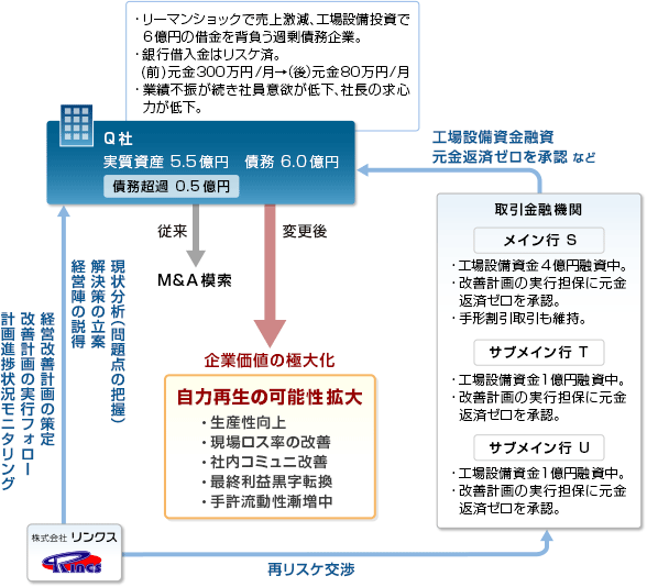 M&Aで会社を売却するにしてもこのまま金融機関の協力を得て「自力再建」を目指すにしても何をやって行けば「再生」するのか見当もつきませんでした。 社員は長年の赤字と低賃金で意欲は低下していましたし、社長の私が号令を掛けても「面従背反」でこのままでは資金も底を衝くのも時間の問題と経理部長から進言もあり、外部の力を借りて社内にカンフル剤を打つことを決めたのです。 リンクスさんは銀行出身とのことで、当社の再生手法に関しても「松竹梅」3パターンのプレゼンがあり、どれも実現性が高く、この人達なら一緒に苦労できると思いました。