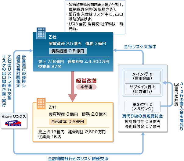 弊社は「倒産の危機」にあった会社です。 税務署と年金事務所から責め立てられ、銀行から求められた計画も出せないと思った時、「倒産」の文字が、私の頭をよぎりました。あのまま諦めていたら、会社も家も失っていた筈です。 人の出会いの機微と言うか、よくぞ私はリンクスさんに出会えたと思います。 たぶん全国には、私と同じような理由で苦しんでいる社長さんが、たくさん居ると思います。可能であれば、是非この人たちの業績と話を聞いてみたら良いと思います。 リンクスさんも積極的に広報をすれば良いと思うのですがね(笑)。
