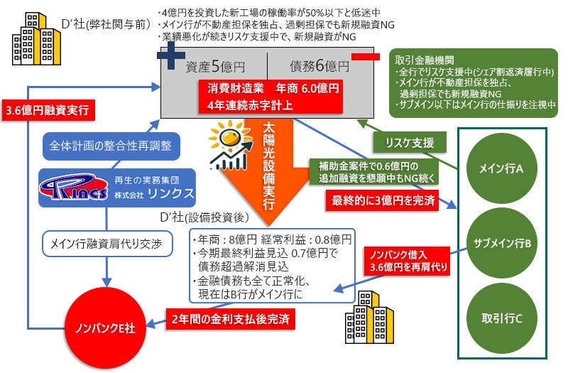 銀行から言われている事をこちらがお知らせする前に指摘して貰えました。 実は最初にメイン行へご一緒した際に、一気に問題解決できればと思っていましたが、メイン行にダメ出しされ専門家でもダメなのかなぁと思ったのですが、日を置かずして「ノンバンクを噛ませる事で事態を変化できるかも」と提案されビックリしました。そんな発想をする人は、私の周りには誰一人居なかったので。 提案された内容を吟味しましたが、計画には無理が無く、想定している利益が実現すれば財務も大きく改善する事が理解できたので、リンクスさんにお願いする事にしたのです。